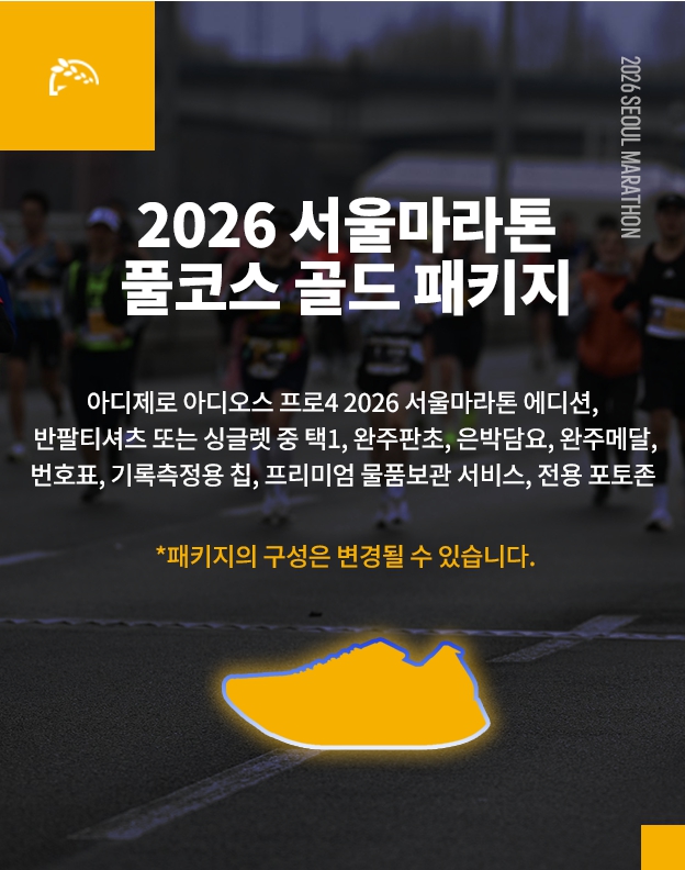 | 풀코스 골드 패키지 | 40만원 | 한정판 러닝화, 티셔츠, 메달, 기록칩 등 |