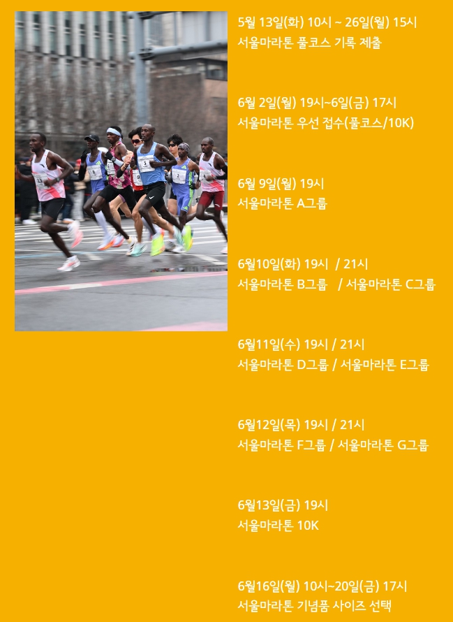 ✅ 접수는 선착순! 알람 설정은 기본, 친구에게 2026 서울마라톤 일정 공유도 필수입니다! 특히 기록 우선권이 중요한 서울마라톤 그룹별 접수를 놓치지 마세요.